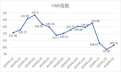 In January and March, the CMI index was 103.32, up from the previous month. According to artisan and customer construction machinery data, CMI, China's construction machinery market index, was 103.32 in March 2020, down 27.21% year on year and up 6.20% month on month (according to CMI judgment standard, CMI dropped slightly above recession point 100, and the market was still affected by the epidemic in the short term, but the downward trend was weakened).